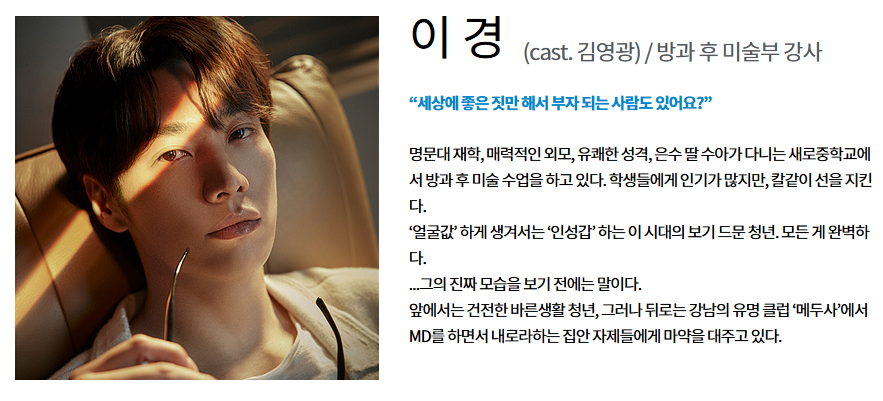 - 김영광 (이경 역) - 두 얼굴을 가진 선생. 은수와 위험한 동업을 맺으며 선과 악의 경계에서 줄타기하는 인물.