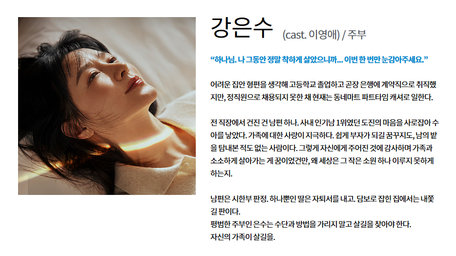 - 이영애 (강은수 역) - 가족을 지키고 싶은 평범한 학부모. 그러나 마약 가방 사건에 휘말리며 극단적 상황에 내몰립니다.