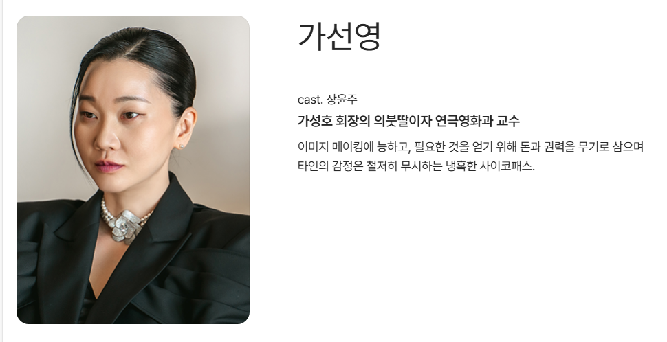 - 장윤주 – 가선영: 회장의 딸, 광기와 야망을 지닌 카리스마 넘치는 존재