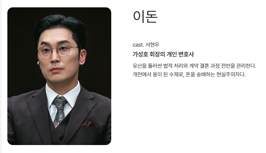 - 문성근 – 가성호: 시한부 재벌 회장, 권력과 유산을 둘러싼 갈등의 중심