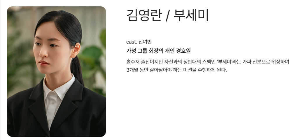 - 전여빈 – 김영란 / 부세미: 계약 결혼으로 재벌가에 입성한 흙수저 출신 경호원
